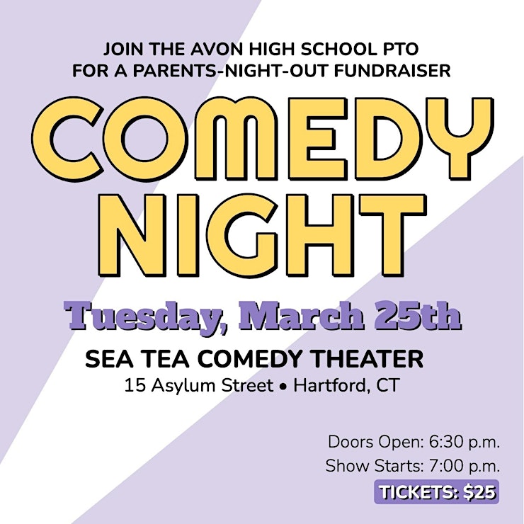Join the Avon High School PTO for a Parents-Night-Out Fundraiser with sketch comedy, improv comedy, stand-up comedy & more! Doors at 6:30PM